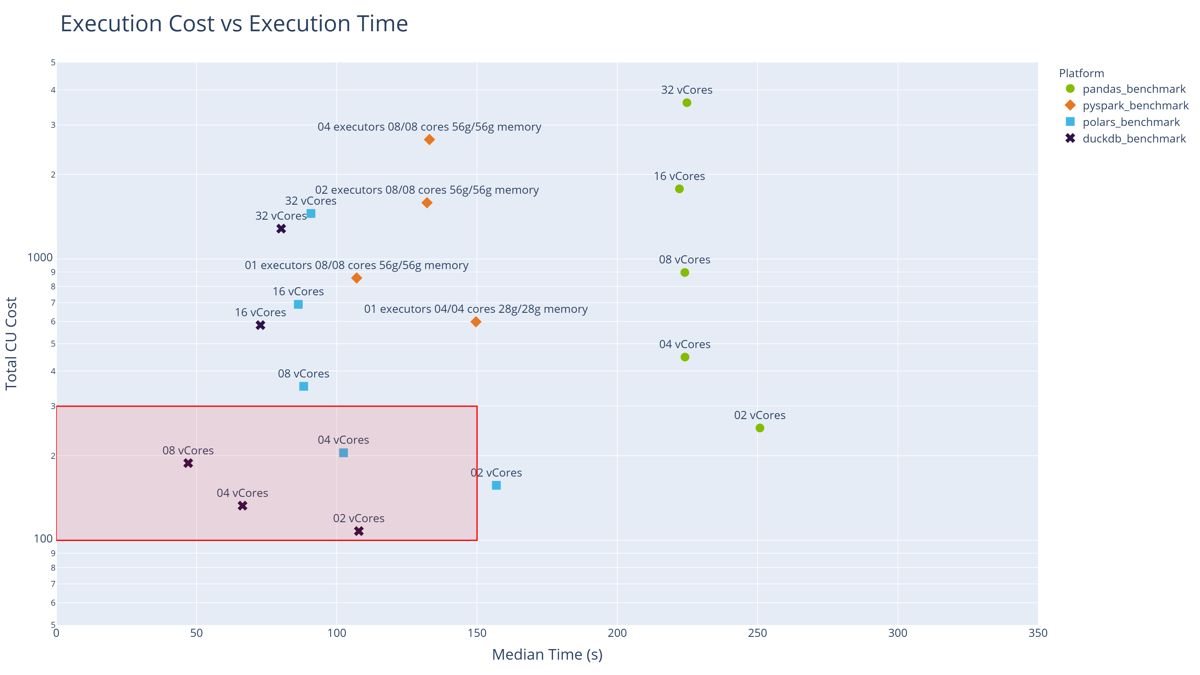 The sweet spot (best combination of fast execution and low cost) lies in the bottom-left quadrant. That space is dominated by DuckDB and Polars.
