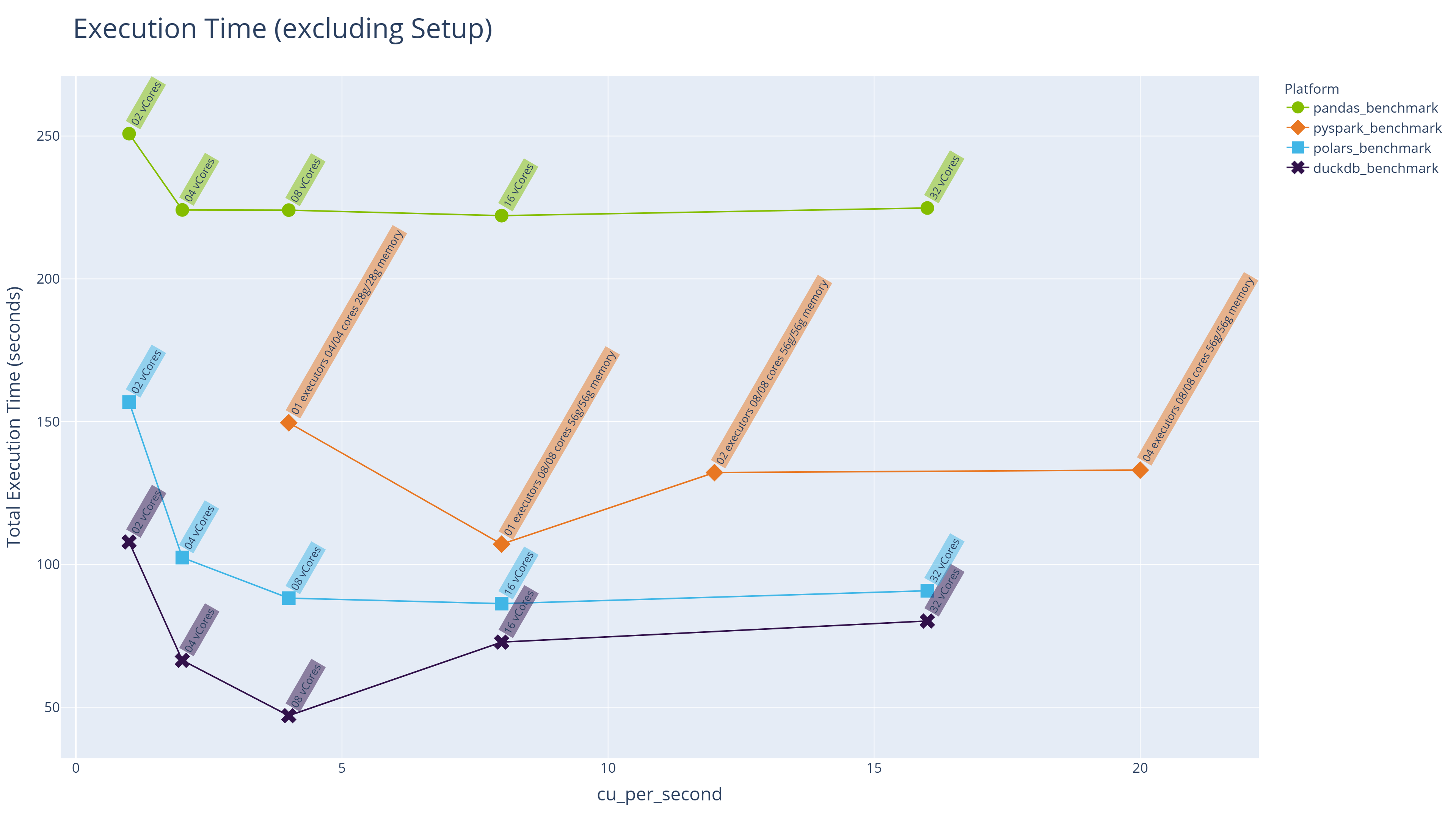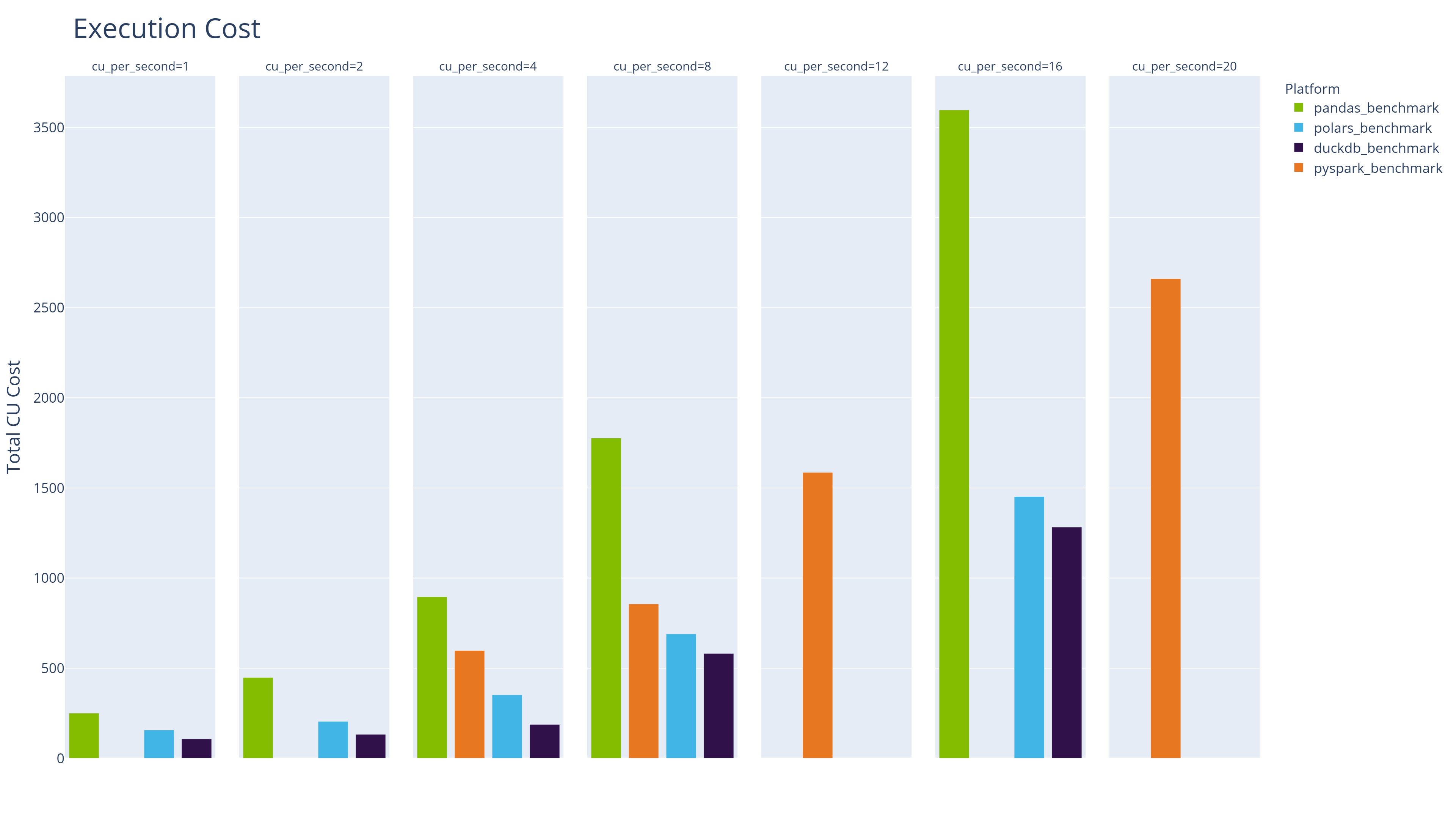 Execution time excludes spin-up and environment provisioning, enabling a direct comparison between engines across configurations at equivalent CU costs.