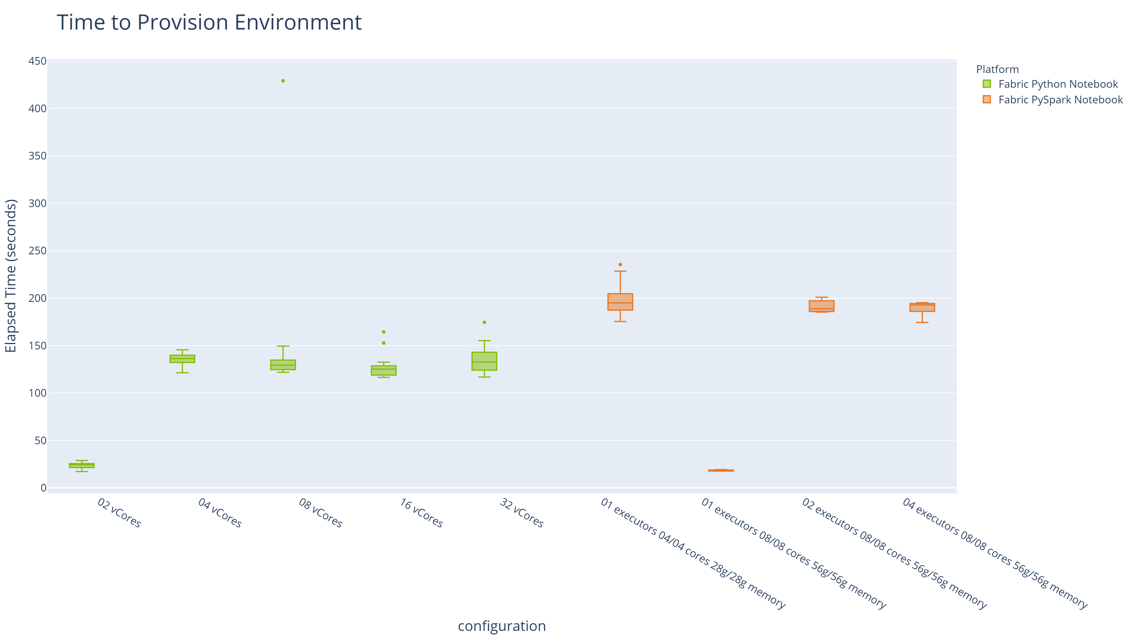 Spin-up times are also materially different, and matter for development workflows. Python Notebooks at the default 2-vCore configuration provision in under 30 seconds. Spark clusters in this study took between 3 and 3.5 minutes at all configurations tested: